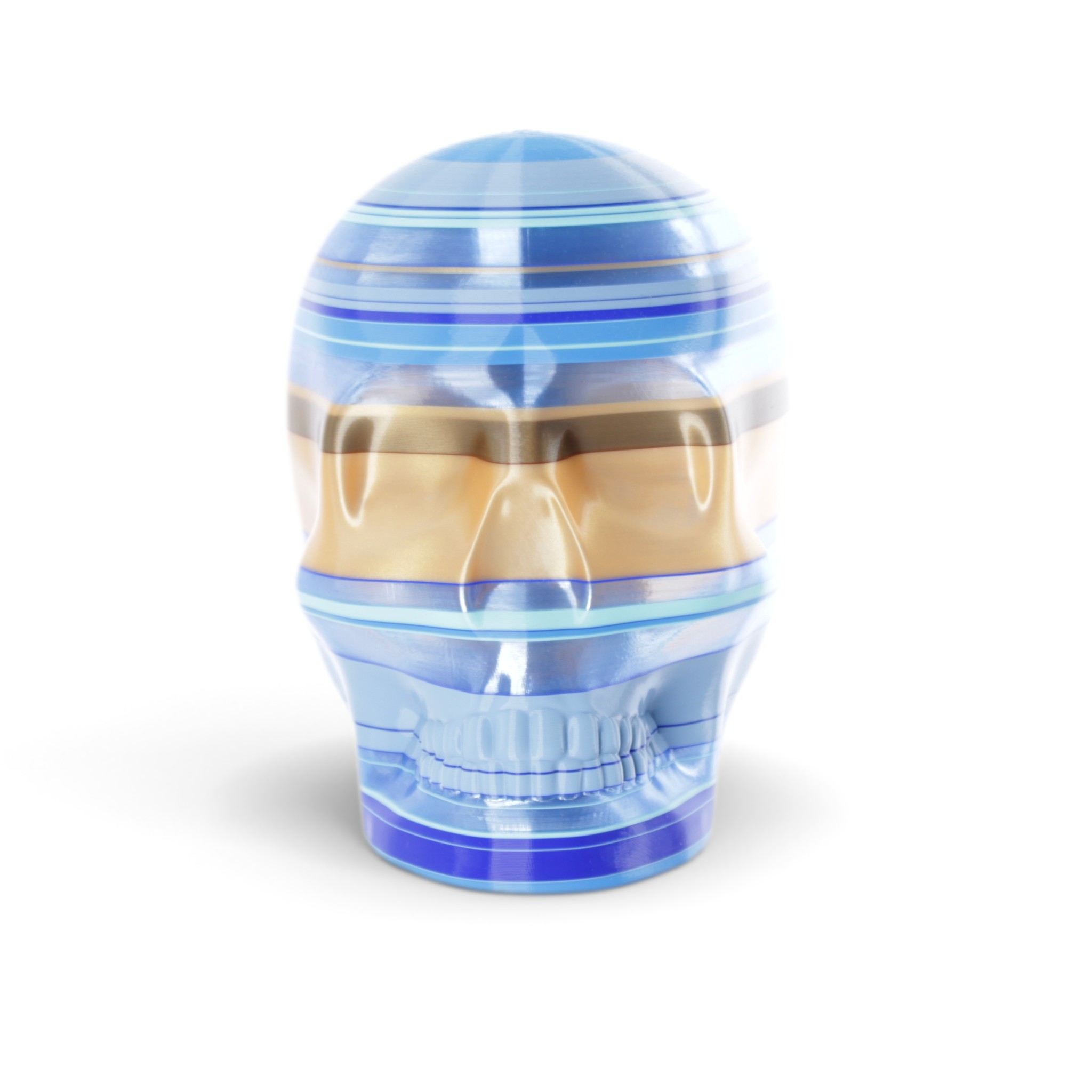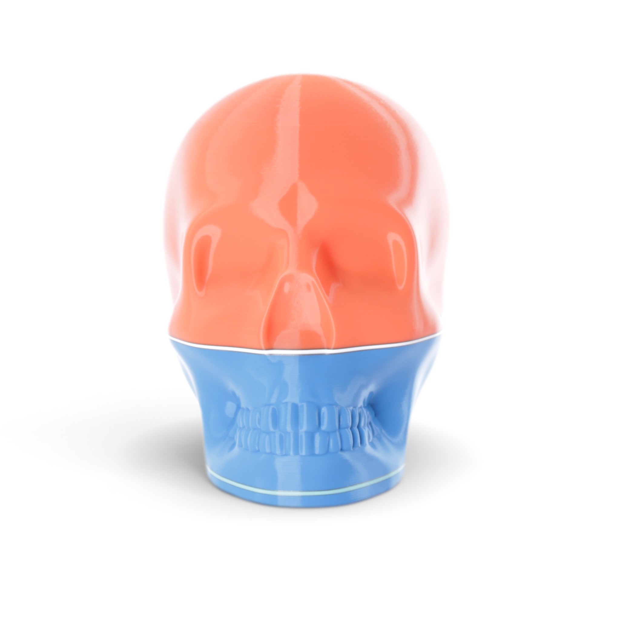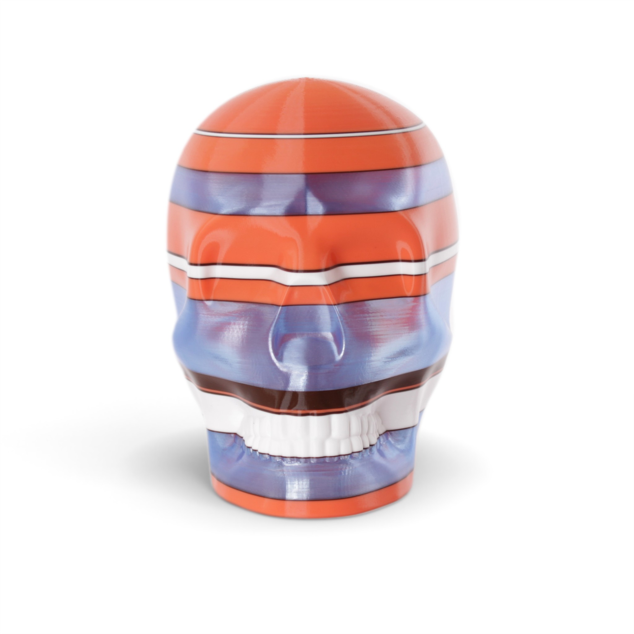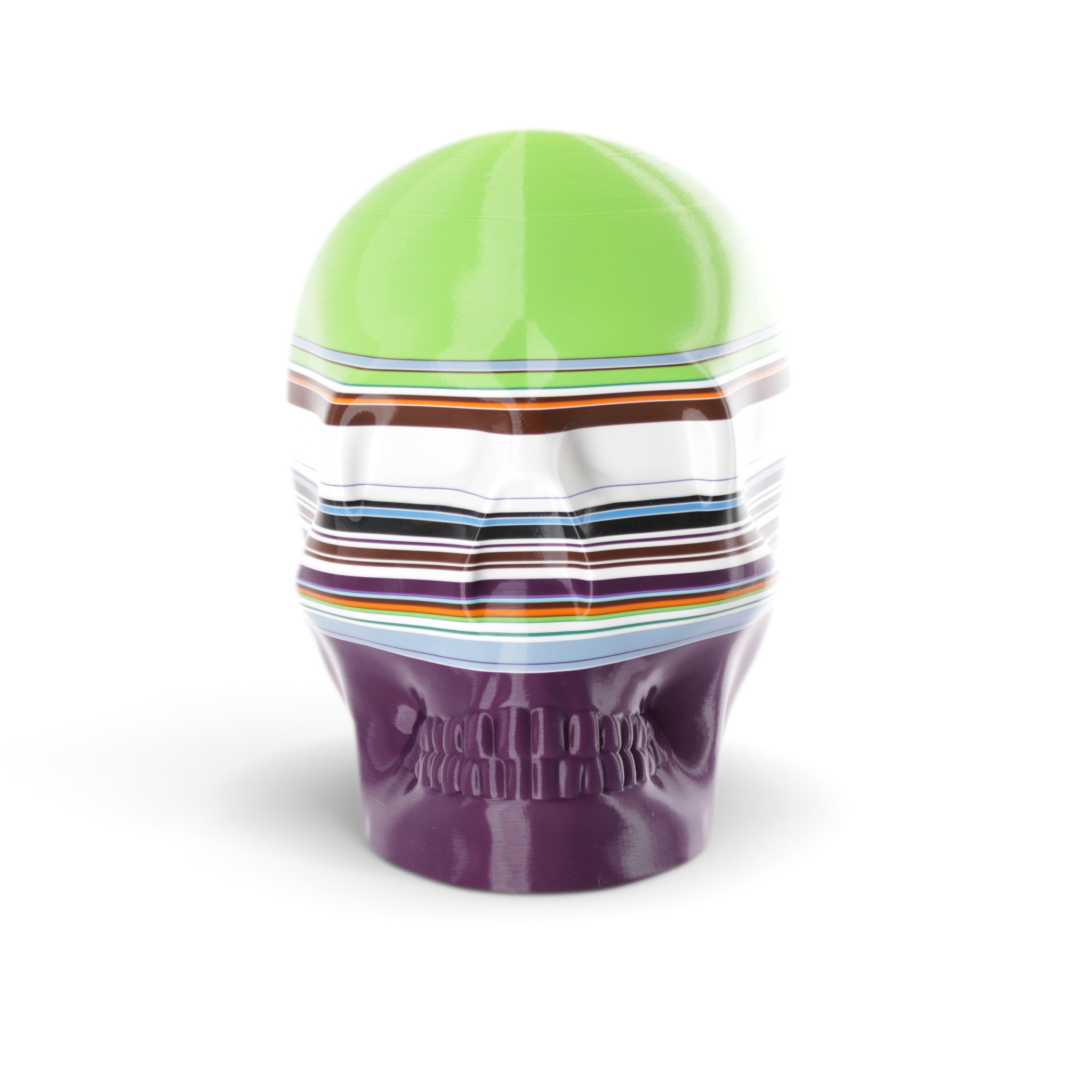The shape in this series is a constant. Like the cups manufactured in the industrial age... they are all the same. Except with 3D printing we can customise and make every object unique... the skulls all have one of a kind colour patterns manually inserted in the 3D printing process.